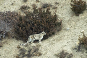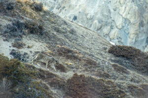 Purba marche à une vitesse impressionnante tout en tirant sur sa cigarette à grandes bouffées. Je n’arrive pas à le suivre. Les yaks sont partis beaucoup plus hauts que d’habitude. Purba a pris de l’avance dans la montée pour rattraper les chauri les plus éloignées. Soudain, j’entends rouler une pierre dans mon dos. Je me retourne, persuadé qu’il s’agit d’une chauri que je n’aurais pas vue. La panthère. Elle est là, face à moi. À peine une dizaine de mètres nous sépare. Immobile, la patte avant levée, elle me fixe de ses grands yeux jaunes. Seuls quelques graviers poursuivent leur course, attirés par la gravité, trahissant son mouvement précédent.